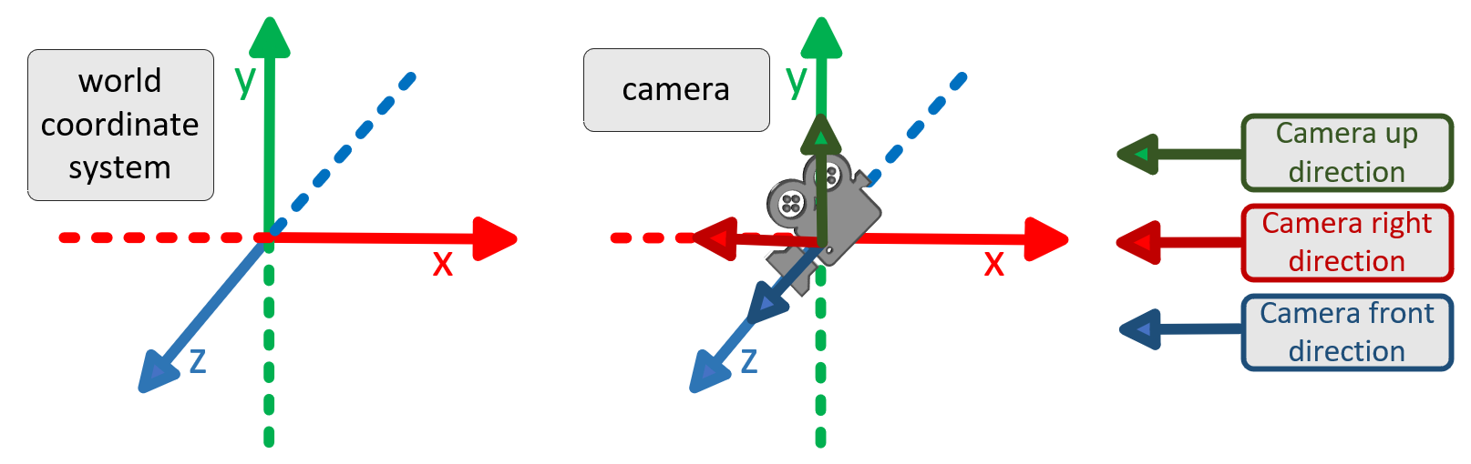- The camera coordinate system in Crystal is the same as Mitsuba. In the camera coordinate system, the camera is oriented along the positive z-axis, with the up vector aligned with the positive y-axis and the right direction corresponding to the negative x-axis.
