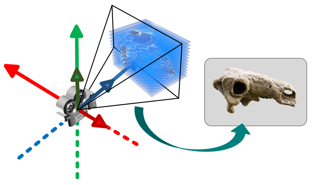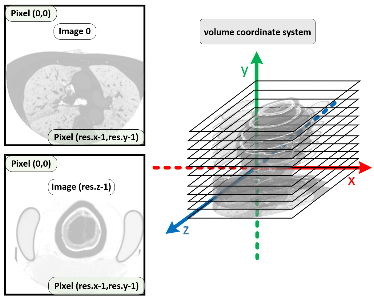 The resolution of the three axes of the volumetric data is denoted as [res.x, res.y, res.z], while the voxel dimensions along these axes in world space are represented as [vs.x, vs.y, vs.z]. The resolution and voxel dimensions are multiplied element-wise to obtain the actual size of the volumetric data, denoted as [v.x, v.y, v.z]. In the local coordinate system of the volumetric space, the coordinate range of the volumetric data is from [0, 0, 0] to [v.x, v.y, v.z].