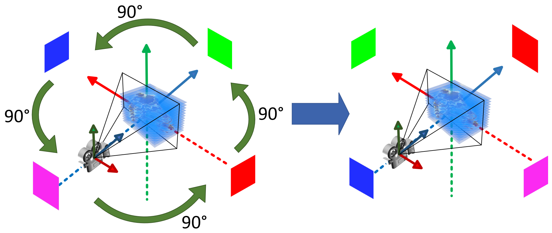 Steps (1) and (2) are collectively referred to as the VolumeToVisSpace transformation, while the combined operations of (1), (2) and (3) are referred to as the VolumeToWorld transformation. In general, step (3) is not applied, allowing the light sources to always point towards the center of the volume data.