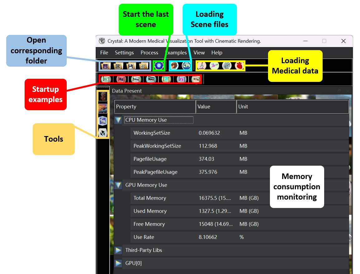 Crystal includes several examples and datasets, which can be accessed and explored through the "Startup Examples" section of the interface.