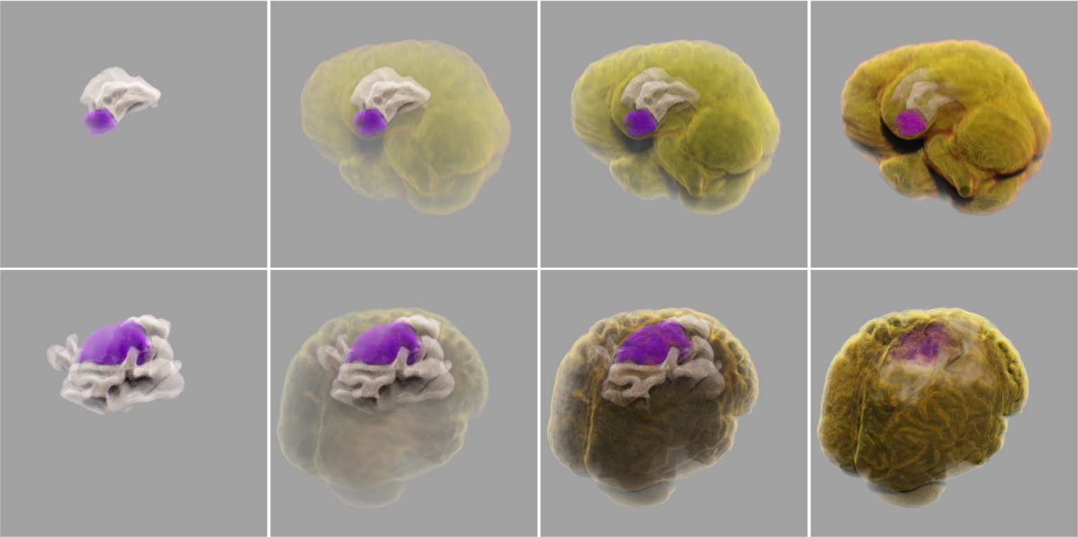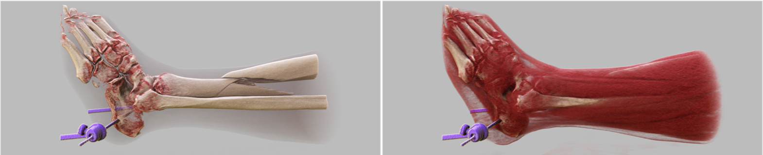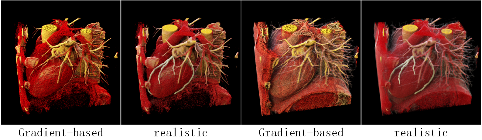 Semantic segmentation techniques are used to extract features of lesions or regions of interest and assign different material properties to them in rendering.